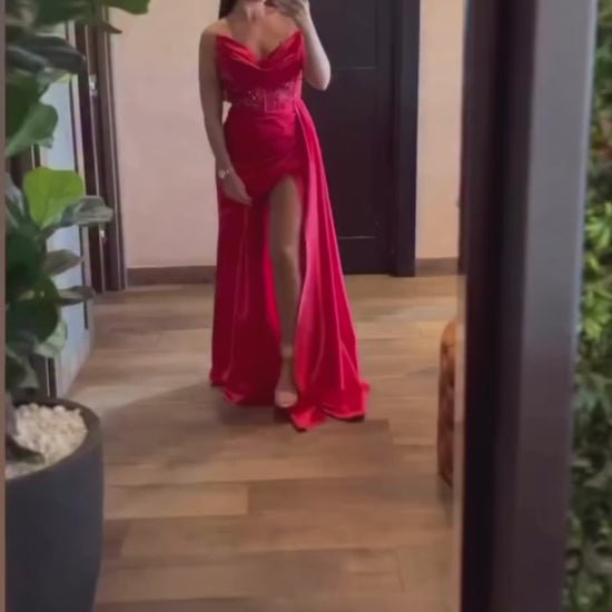 A breathtaking masterpiece of elegant sophistication. This luxury evening gown features a romantic cowl neck, beautifully draped satin bodice, hand-beaded crystal belt, dramatic high thigh split, and flowing train.