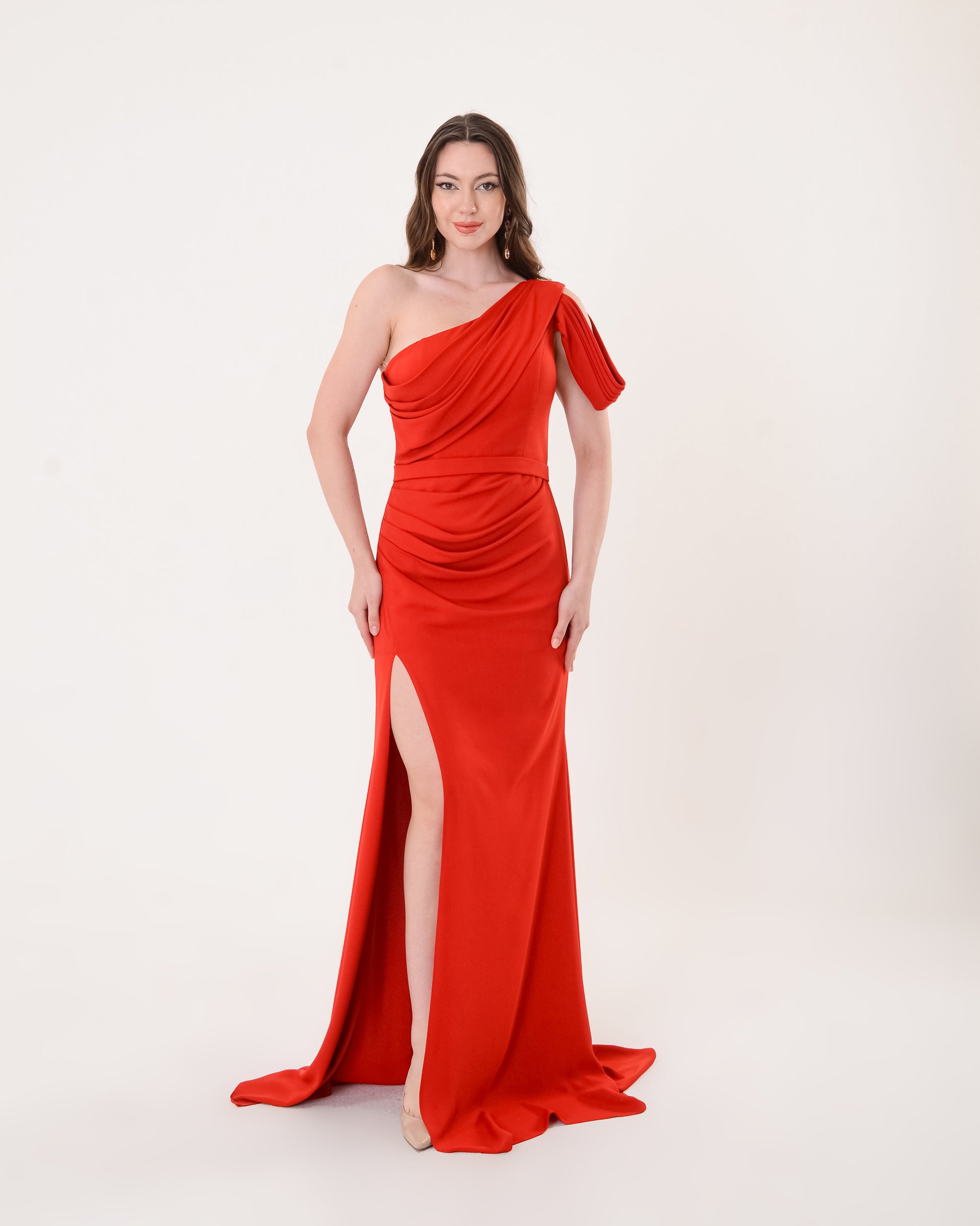 Scarlet One-Shoulder Evening Gown with Thigh Slit